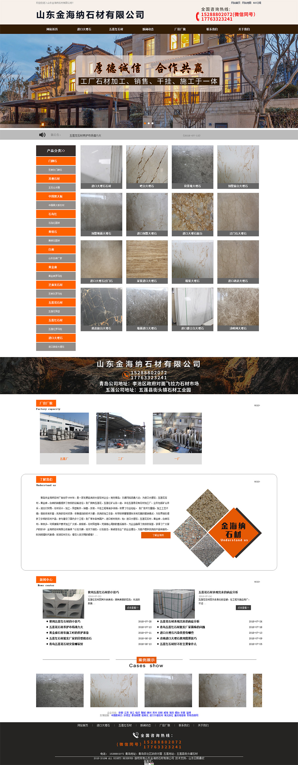 • 青島市金海納石材廠始 創(chuàng)于1998年,是一家發(fā)展起來的大型石材企業(yè)。地處青島,交通網(wǎng)絡(luò)四通八達,為進 口大理石、五蓮花石材、黃金麻、白麻的銷售提供了良好的運輸途徑。我廠擁 有五蓮花、五蓮紅礦山各一座,并在五蓮縣設(shè)有石材加工廠,業(yè)務(wù)包括礦山開采、進出口貿(mào)易、石材設(shè)計、加工、異型制作、銷售、安裝、干掛工程等諸多領(lǐng)域,積累了行業(yè)經(jīng)驗。 我廠技 術(shù)力量強,加工工藝不錯,借助本地優(yōu)良的石材資源,依靠強勁的技 術(shù)力量、優(yōu)良的加工設(shè)備、科學(xué)的質(zhì)量管理體系和完善的營銷模式,為各界朋友提供了多樣的石材產(chǎn)品,參與建設(shè)了國