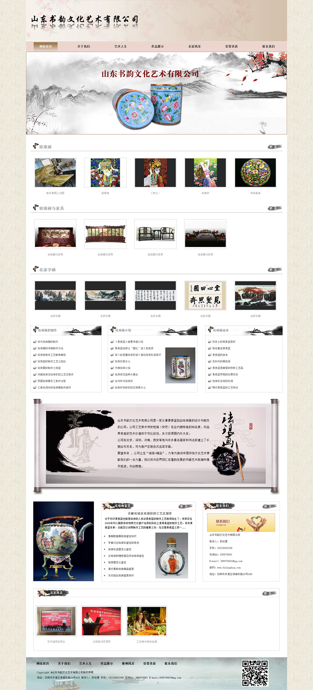 • 山東書韻文化藝術(shù)有限公司是一家從事景泰藍(lán)掐絲琺瑯畫的設(shè)計(jì)與制作的公司。公司工藝美術(shù)師安桂娟(安然)在業(yè)內(nèi)擁 有高的知 名度,作品具有高的藝術(shù)價(jià)值和不能比較性,多次獲得國 內(nèi)外大獎(jiǎng)。 公司在北京、深圳、濟(jì)南、西安等地與許多著 名畫家和書法家建立了長期合作關(guān)系,可為客戶定制各式名家字畫。 展望未來 ,公司立足“誠信+精 品”,力爭為推動(dòng)中國傳統(tǒng)文化藝術(shù)奉獻(xiàn)我們的一點(diǎn)力量。我們將與各界同仁在蓬勃發(fā)展的書畫藝術(shù)新潮中攜手前進(jìn),共創(chuàng)輝煌。