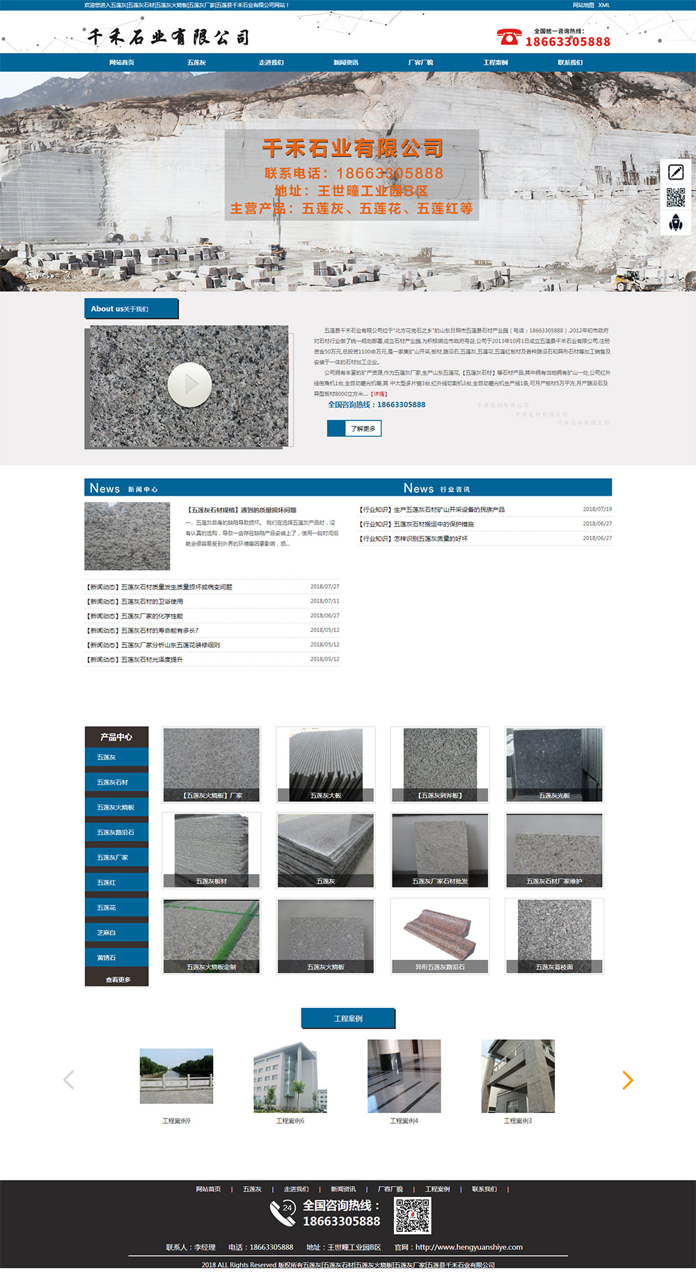 • 五蓮縣千禾石業(yè)有限公司位于"北方花崗石之鄉(xiāng)"的山東日照市五蓮縣石材產(chǎn)業(yè)園(電話:18663305888).2012年初市政府對石材行業(yè)做了統(tǒng)一規(guī)劃部署,成立石材產(chǎn)業(yè)園.為積極響應市政府號召,公司于2013年10月1日成立五蓮縣千禾石業(yè)有限公司.注冊資金50萬元,總投資1100余萬元,是一家集礦山開采,板材,路沿石,五蓮灰,五蓮花,五蓮紅板材及各種路沿石和異形石材等加工銷售及安裝于一體的石材加工企業(yè).